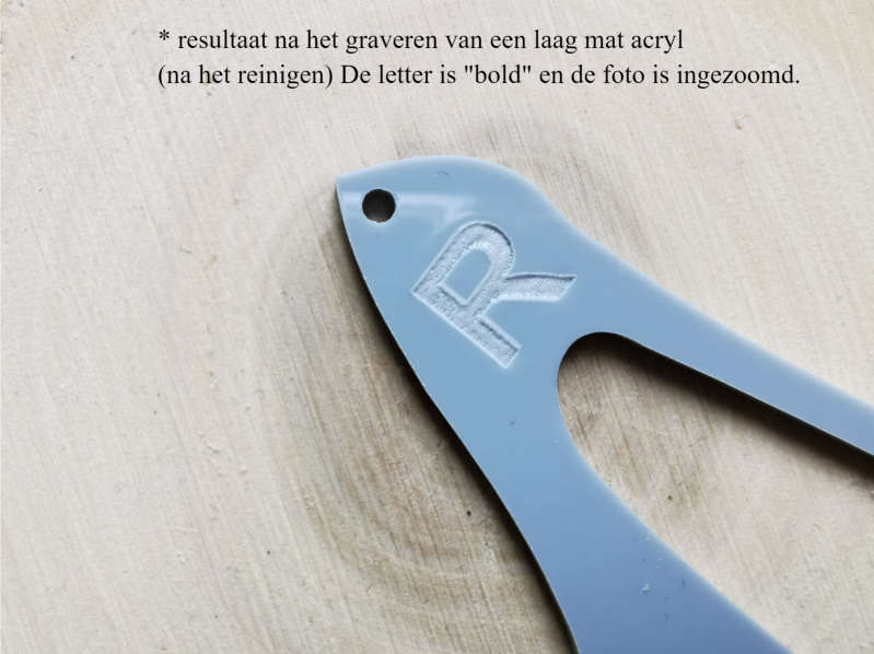 Bij acrylproducten zoals kerstplaatjes en glam sleutelhangers raden wij aan een letter of max 1 kort woord te graveren. Zo kunnen wij "bold" graveren en is het resultaat goed zichtbaar. Ook hierbij geldt "hoe meer woorden je selecteert hoe kleiner wij graveren".