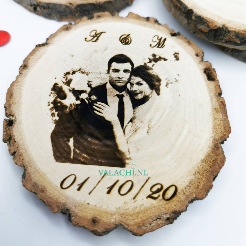 Hieronder een foto van een houtenschijf van 11,5 cm met foto + voorletters + datum
