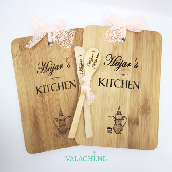 Deze leuke set is 4 delig en bestaat uit 2 broodplankjes, een mesje en een lepeltje. Allemaal naar wens gegraveerd.