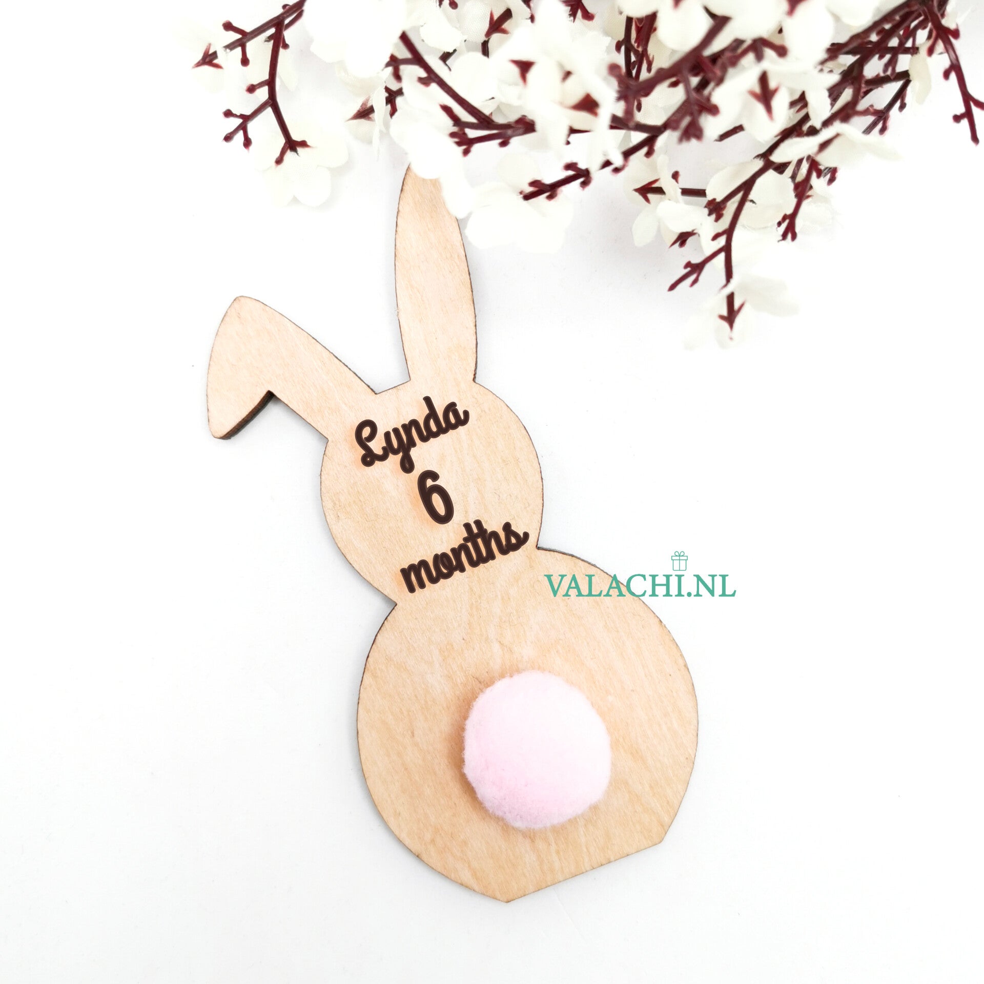 Deze leuke mijlpaal houten decoratie is een mamas favoriet. De houten konijntjes worden naar wens gegraveerd. Wij kunnen een naam, datum of aantal maanden graveren.